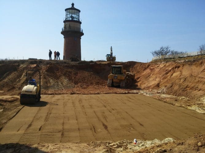 Another challenging consideration was the social, economic, and sustainable development of the Gay Head Lighthouse project. The Gay Head Cliffs and surrounding lands have a sacred ancestral and significant cultural importance to the Wampanoag Tribe. To respect this connection between the land and the Tribe, excavations were kept to a minimum and similar soils were stockpiled separately as they were removed so that an attempt could be made to replace the soil in “reverse” order after completion of the project.